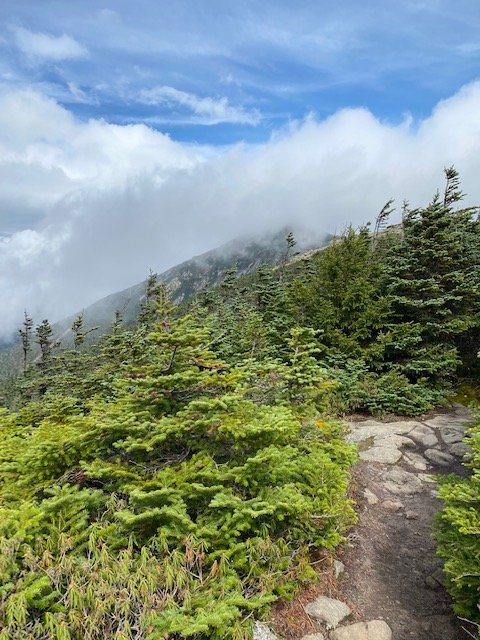 Cat Tracks and I, we’ve a short hike from Liberty Springs trailhead to the AT. From there its up and up we go (again) through the heap of boulders and ledges. Its an uninterrupted ascent of 3,400 feet in less than five miles–to gain Franconia Ridge. We’ve not made it to the top before Odie (being the incredibly strong hiker he is) closes the gap to catch us.