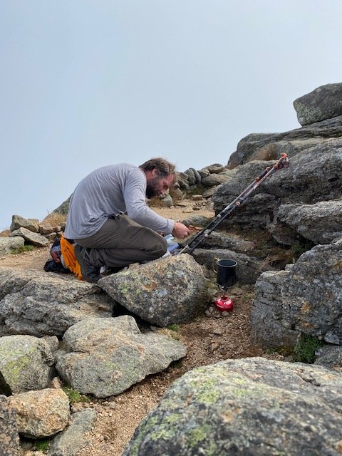 We’re fortunate to have reached Little Haystack prior to becoming cloud-bound. Before reaching Mount Lincoln (5,089 feet), then Mount Lafayette (5,260 feet) we’re totally engulfed in the cold, wind-driven shroud. No views from either bouldered topout. Just as well, for tarry we must not. Our destination today, just beyond a small spring, a sheltered campsite in the spruce at 3,800 feet. So, now it’s down and down some more, through the wet-slick boulders and treacherous off-camber ledges.