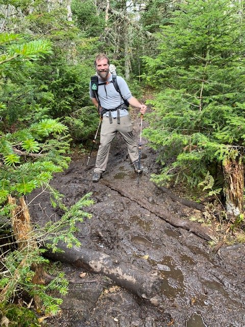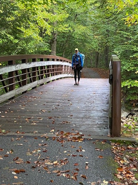 Up at five for a very long day. First, the shuttle to the trailhead. It’s a very long drive for Odie, but he has me and Cat Tracks on trail before eight. Second, so logistics get squared away for the next two days, Odie drives his (Hiker Yearbook) bus around to Gale River trailhead (the four-mile access trail to/from Galehead Hut) where we’ll come out/down tomorrow evening. Acadicus picks Odie up there and drives him back around to Liberty Springs trailhead, from where he then hikes in (up) to catch us.