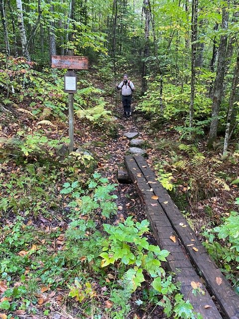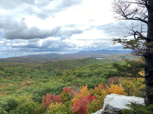 There’s an old fire tower on the summit of Smarts. Odie goes up, but the mountain is socked in, no views, so I take a pass on climbing the tower and move on. As the trail descends along a narrow ridgeline, it follows exposed ledges. And from the ledges are there views of the valley below. The captivating spell of fall is definitely upon us. There’s color on the mountain now, and it’s becoming brighter and more radiant each day.