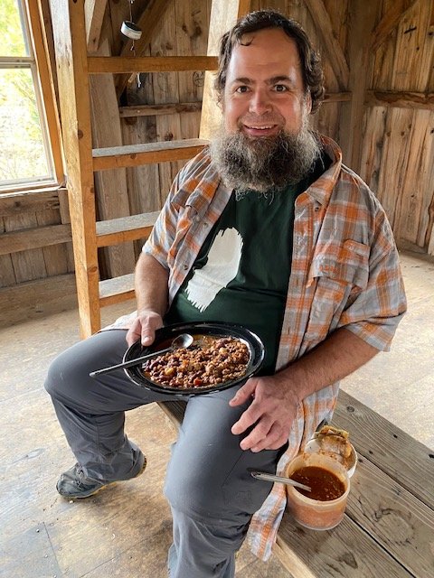 And the “Lookout?” Even more special! A small observation deck (crow’s nest) has been built right on the cabin roof peak, with another step-like ladder leading (almost straight) up to it. We drop our packs on the porch, take a break for lunch. Kitchen Sink fires up his stove, then prepares the finest dish of chili (compliments of MaKensi, HAT Hostel) and serves it to me on a full-size porcelain plate he keeps tucked away in his pack. Now you understand why he’s been given the trail name, Kitchen Sink! The vista photos today were taken from atop The Lookout, Richard & Teresa’s delightful cabin. Dear folks, Lookout Farm, thank you for sharing your little corner of paradise with us!