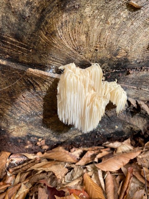 If you’ve followed my journals at all, you know I’m fascinated by the various mushrooms seen along the trail. The delicate one photographed today is called lion’s mane. Oh, and the smiley-face lichen photo–what you see has not been touched, totally natural!