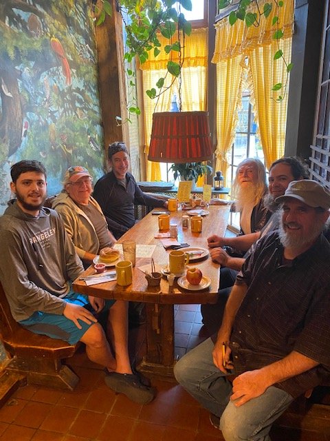 This morning, we take advantage of another fine benefit offered here at the hostel–deep discount on breakfast at the Yellow Deli, seven-thirty, right downstairs, prepared by Aysh. In that photo: Barry, Kitchen Sink, Space Blanket, Slim Jim, me (and cook) Aysh.