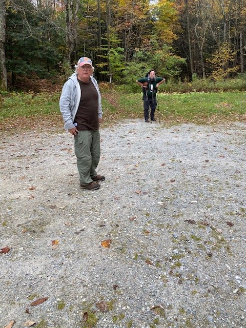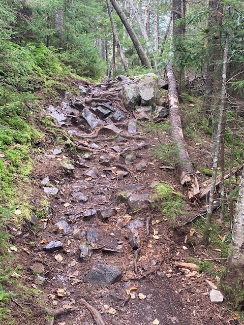 A long shuttle back to the trailhead by Barry, and Kitchen Sink and me, we’re on trail at nine-thirty. Ascent and descent today, 1,750 feet up, 1,500 down. We’re into the climb right away. More rocks and roots, reminiscent of the cobbed-up trail dealt me in Maine and New Hampshire. This gets me grumbling right off the bat. Bad attitude. Shadows me the entire day. Three bite-the-dirt stumble-falls doesn’t help my disposition. More knee and elbow skid marks.