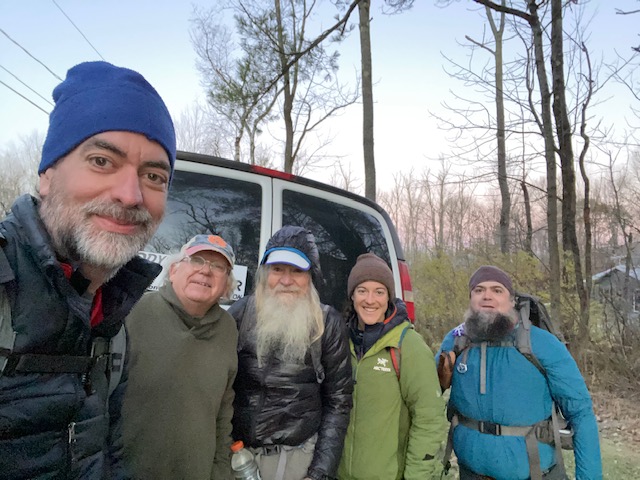 Thankfully, on trail today and hiking with me: Slim Jim, Kitchen Sink & Pooter Scooter. They watch over me, help and support me with compassion and understanding–as I struggle uphill and downhill through the mud and leaf-covered rocks and roots. I fall a lot and whine a lot. Ahh, but does not their patience and good humor carry me through–this long, tiring day…