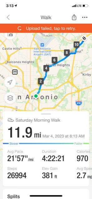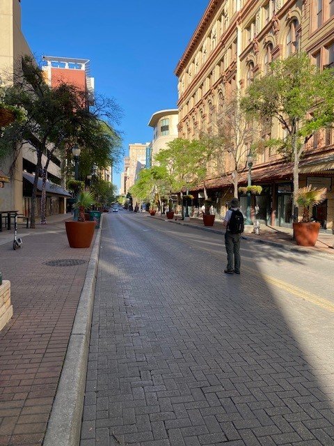 Getting into San Antonio yesterday was an adventure in itself. As the plane taxied from the terminal to the runway (in Joplin, Missouri, where I’d been staying with Sherrie & Carol, dear friends from my Route 66 hike days) the plane just stopped, and there we sat, for the longest time. Finally, the captain came on and said there was a problem with the aircraft and that we’d have to return to the terminal—where we were told to deplane. Anyway, I ended up getting into Denver two hours late, where I missed my connection to San Antonio. Fortunately, I was able to get on a later flight. And just at sunset, Barry was right there at the San Antonio airport to get me!